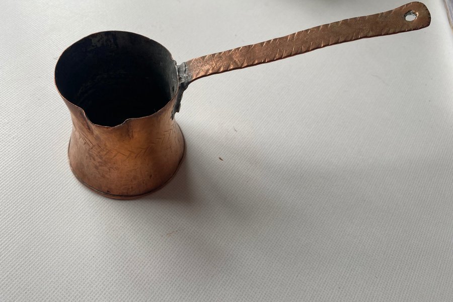 Kopparkanna med handtag. Kannan har en klassisk form och handtaget har ett dekorativt mönster. långt handtag ca 21 cm. höjd 9 diameter 8
