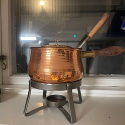 Detta parti innehåller 8 kopparföremål. Det finns två kaffekannor, en mjölkkanna, en vas, två grytor, en gräddkanna och två mindre kannor. Föremålen är i koppar och mässing tror jag!