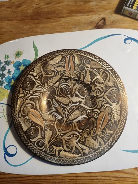 En dekorativ kopparplatta med ett detaljerat blommönster. Plattan har en mörk bakgrund med ljusare, graverade detaljer som framhäver blommor och blad. Runt kanten finns ett repeterande vågigt mönster.
