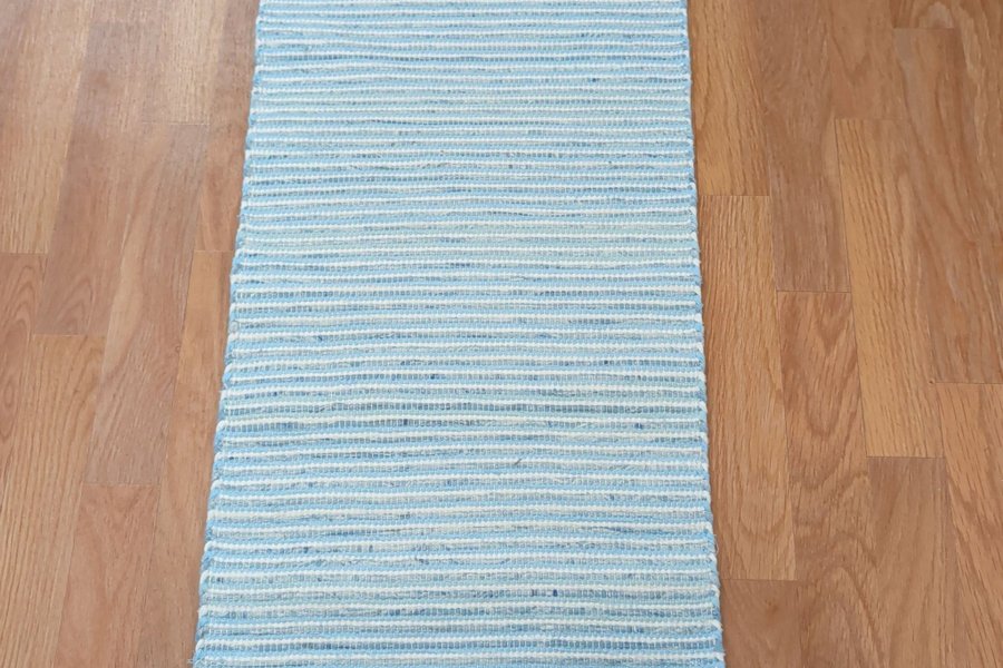 En fin trasmatta i blått och vitt. Mattan har fransar på kortsidorna.