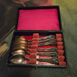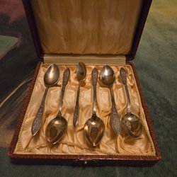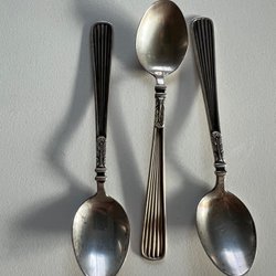 Tre silver skedar. En sked är märkt med 'I.M.A. W:S:C:I:R:C'. En sked är märkt med 'N.O. ROTLOFF' och 'MARS'. En sked är märkt med 'C&A'.