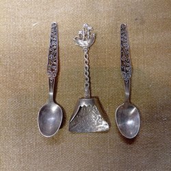 Ett set med silverbestick, inklusive en sked, en tång och en sax, alla med detaljerade blommotiv. Totalvikten för besticken är 78.48 gram.