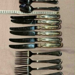 18 delar, 6st knivar, 6st gafflar och 6st skedar. De är märkta "Mema ex alp", Begagnade men blygsamt använda eller möjligen inte använda alls. Vissa bestick har viss oxidation.