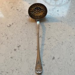 Den tredje skeden har en oval skål och är förgylld. 18 cm.