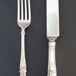 Bestickset med skedar, gafflar och knivar. Handtagen har en brun färg.