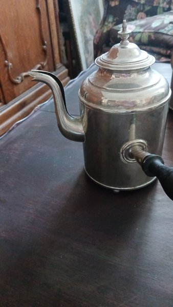 Chokladkaka i metall med handtag i trä. Kannan har ett lock med en dekorativ knopp.