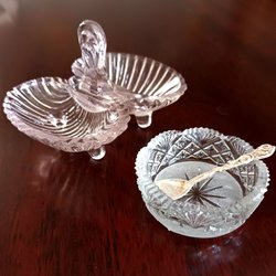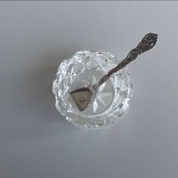Saltkar i glas med tillhörande sked.
