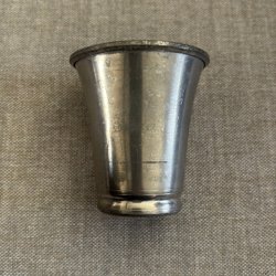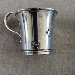 Slev i nysilver med dekorativa detaljer på handtaget.