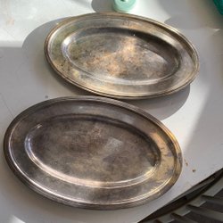 Ett set med silverfärgade fat. Faten har en räfflad kant.
