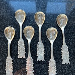 En vacker silver sked märkt med 830S & flera stämplar enligt foton. Är inte helt säker på om mönstret heter Valdes & Design av Nils Hansen i början av 1930-talet? Den väger 21g. och är 11,5 cm.