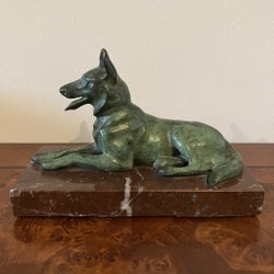 Detta är en skulptur av en hund, den är ca 19 cm lång och 10 cm hög vid öronen. Lite nött bakom öronen och på ryggen, annars i fint skick. Ingen signatur. Titta gärna på våra övriga auktioner, vi samfraktar gärna! Vi använder Traderas vinnar mail, där står betalnings anvisningar. We ship world wide, please ask for shipping quotes before you buy. Overseas customers-Paypal only.