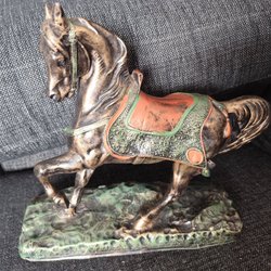 Dekorativ hästskulptur som fångar hästens elegans och kraft. Denna staty är en vacker inredningsdetalj som passar perfekt i bokhyllan, på skrivbordet eller som en del av en större samling. Hög 25,5 cm, basen 22,5 cm x 10 cm., vikt 1 kg. I mycket gott skick, basen har nåt som liknar liten spricka, se sista bilden men det kommer från produktionen, så var det när jag köpte statyn.
