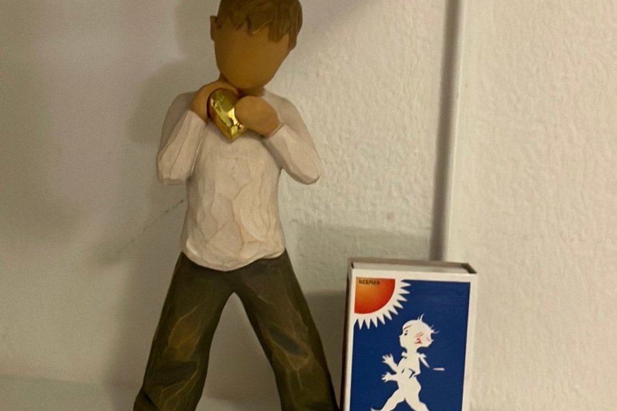 Willow Tree figur. Pojke med ett gyllene hjärta. En vacker skulptur ur Willow Tree-serien, skapad av konstnären Susan Lordi.