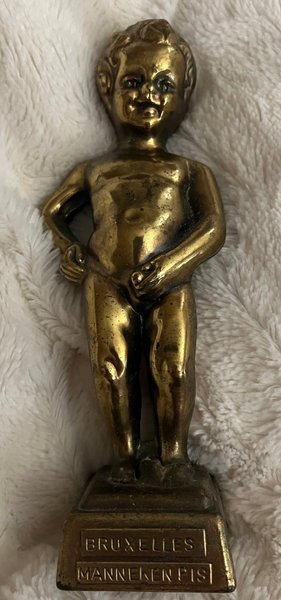 En staty av Manneken Pis med texten "Bruxelles Manneken Pis" på basen.