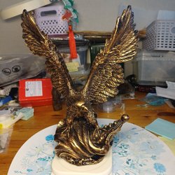 En dekorativ örn skulptur i guldfärg. Höjden är cirka 29 cm. Färgbättringar på många ställen, se niga på bilder innan du lägger ett bud. Jag kan skicka fler detaljerade bilder vid intresse.