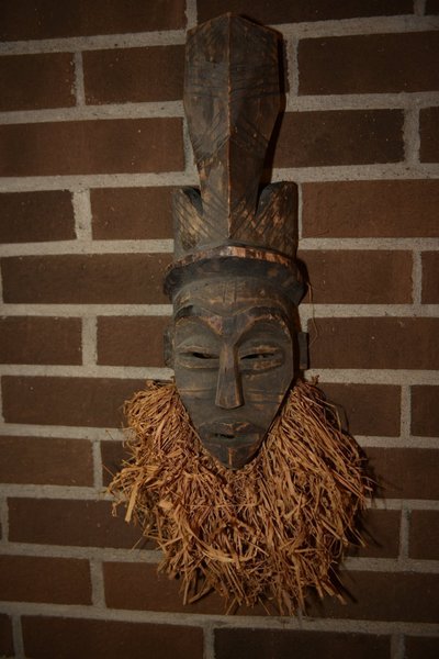 Afrikansk mask i snidat trä med raffiaskägg.