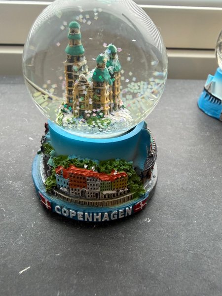Snöglob med motiv av byggnader från Köpenhamn. Snögloben innehåller glitter som virvlar runt när den skakas. Basen är dekorerad med detaljerade miniatyrer av stadens arkitektur och texten "COPENHAGEN".
