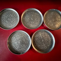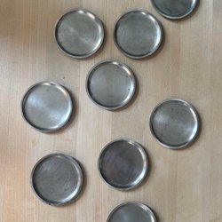 Sju underlägg i tenn med dekor.