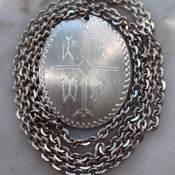 Ett silverfärgat halsband med en rund medaljong med i olika symboler,detaljer i vacker handgjort i tenn.