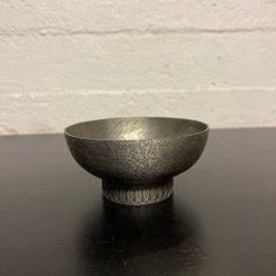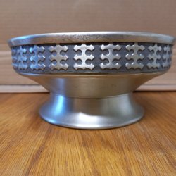 Dekorativ tennlskål med fot och detaljerade mönster.