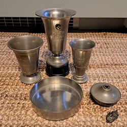 Ett paket med föremål i Svenskt Tenn och Skandia tenn. Fatet går att hänga upp på väggen. Ett av snapsglasen är inte helt runt i formen
