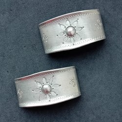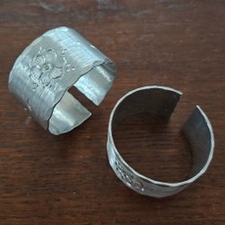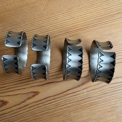 Servettringar med olika mönster. Ganska säker att materialet är tenn. Inga stämplar vad jag kan se. Sex till antalet.