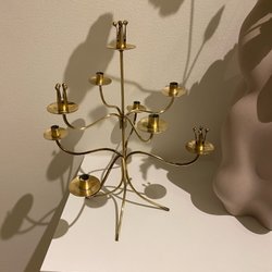 En elegant och tidlös kandelaber i mässing från anrika Gusums Bruk – ett stycke svensk designhistoria. Denna vackra sjuarmade ljusstake har en klassisk och välbalanserad form som ger ett ståtligt intryck. Ljushållarna är symmetriskt placerade för att sprida ljuset jämnt och skapa en varm, inbjudande atmosfär, oavsett om den står på ett matbord, en skänk eller i ett fönster.