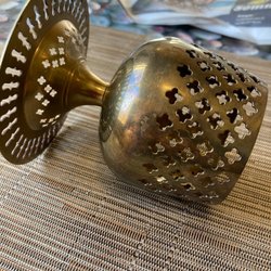 Dekorativ ljuslykta i mässing med utskurna former. Skapar ett fint sken när ett ljus är tänt inuti.