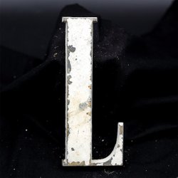 Overmalet facadebogstav i massiv messing med smuk rå patina, afskallet maling og naturlig oxidation. Et dekorativt lille bogstav med to originale gevindstænger på bagsiden.
