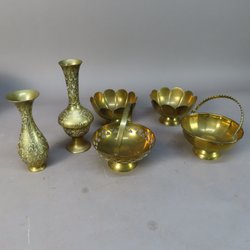 Ett set med mässingsföremål bestående av två vaser, en kanna, en stor skål, ett avlångt fat och fem små fat.