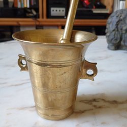 En mortel i mässing med handtag och dekorativa detaljer.