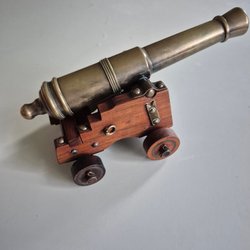 Gedigen mässingsskulptur, hjulen går att rulla och kanonen är ställbar.