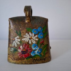 En liten mässingsklocka, 6 cm hög men med stor kläpp och kraftig klang.