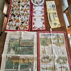 Ett set med diverse textilier som inkluderar broderade dukar, en grön-vit rutig kökshandduk och ett grytunderlägg.