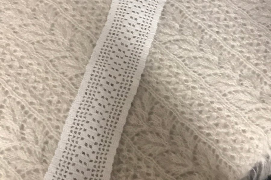 Vit virkad festremsa med ett intrikat hålmönster. Den avlånga formen gör den lätt att styla på olika sätt.