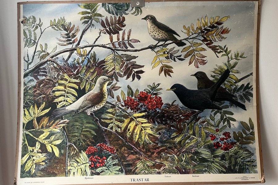 Skoltavla med motiv av trastar. Bilden visar olika trastfåglar som Björktrast, Taltrast och Koltrast. Kostnär Nils Tirén 1929