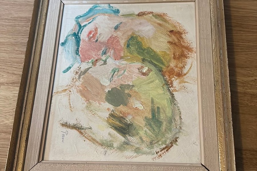 Målad tavla med abstrakt motiv. Färgerna är dämpade i rosa, grönt och blått.