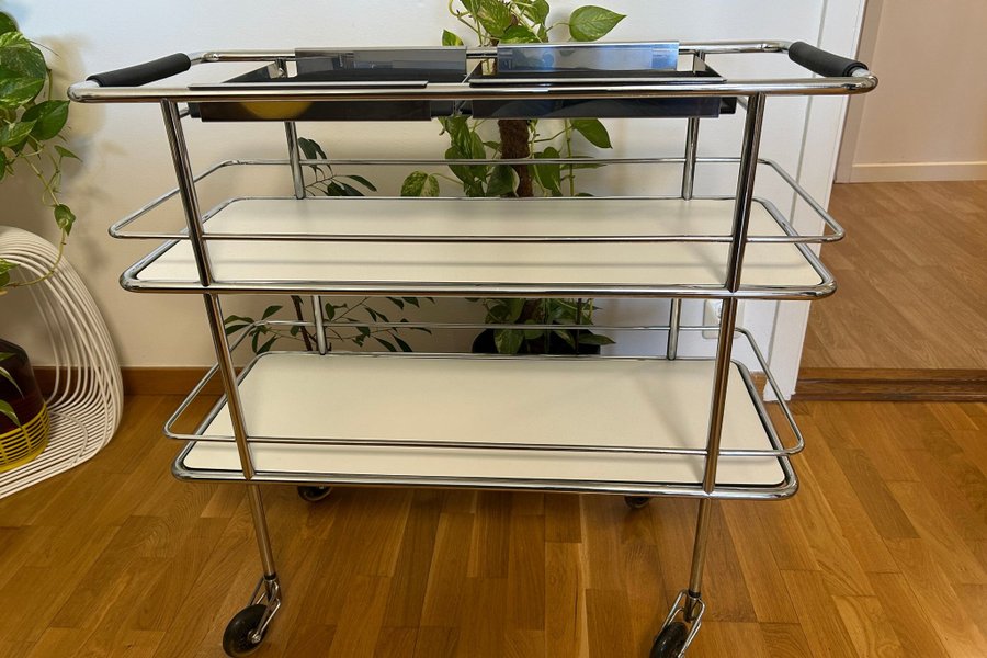 Kromat stativ. Vita laminatskivor. Svarta läderhandtag. Designer: Gunilla Allard.