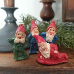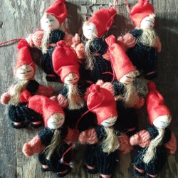 6 st gamla handgjorda garntomtar med vaddskägg, observera att en av tomtarna har inget skägg.