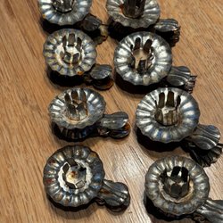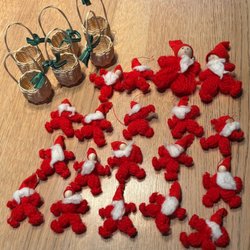 Hjärtan, klockor, tomtar mm i trä. Äkta hantverk. Häng i granen eller som örhängen till jul. Mått cirka 9 cm. Från tidigt 1970-tal.