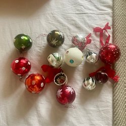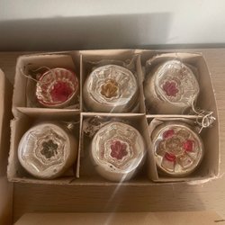 Sista bilden visar ett större parti julgranskulor och pynt som är separerade i olika auktioner.