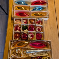 Tre lådor med julgranskulor.