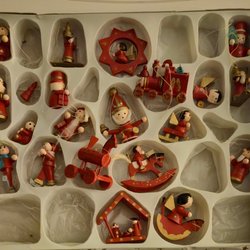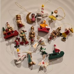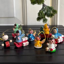 Ett set med åtta stycken julgransprydnader i trä. Inkluderar figurer som björnar, tomtar, en flicka, en soldat och en liten scen med en mus och en brevlåda. Perfekt för att dekorera julgranen med en klassisk och charmig stil. Storlek se sista bilden.