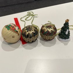 Två stycken julgranspynt i form av tomtar. Den ena tomten bär på en säck och har en käpp. Den andra tomten bär också på en säck