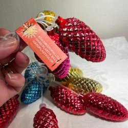 Nu ligger julen runt hörnet, säljer därför ett set med 11 julgranskulor i form av kottar. Kulorna är i färgerna guld, röd och blå. Perfekt för att dekorera julgranen. Kottarna är av äldre modell och har normalt åldersslitage.
