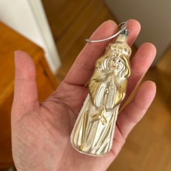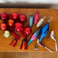13 äldre julgranskulor i glas, bl.a. två trumpeter, en fågel, två klockor med små plingor, två reflektorer och två avlånga.
