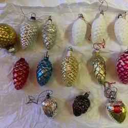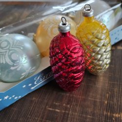 Nu ligger julen runt hörnet, säljer därför ett set med 11 julgranskulor i form av kottar. Kulorna är i färgerna guld, röd och blå. Perfekt för att dekorera julgranen. Kottarna är av äldre modell och har normalt åldersslitage.