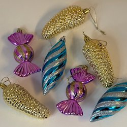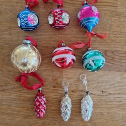Julgranspynt från 70-talet, och äldre. Tre kulor har halva delen i genomskinligt material, ett plast äpple finns och två kottar. Se bilder för skick och innehåll !