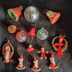 Ett set med vintage julgranspynt. Inkluderar figurer som tomtar, snögubbar och änglar i rött och vitt. Perfekt för att skapa en traditionell julstämning.