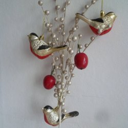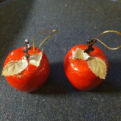 Julgranspynt i form av röda äpplen med blad och guldfärgat upphängningssnöre. 12 st. De är ca 6 cm i höjd. Tillverkat i hårt plastmaterial. Ett äpple har tappat sin kvist och ett har blivit skrapat. Övriga är i jättefint skick. Se bilderna. Obs det svarta trädet de hänger i ingår inte i köpet.